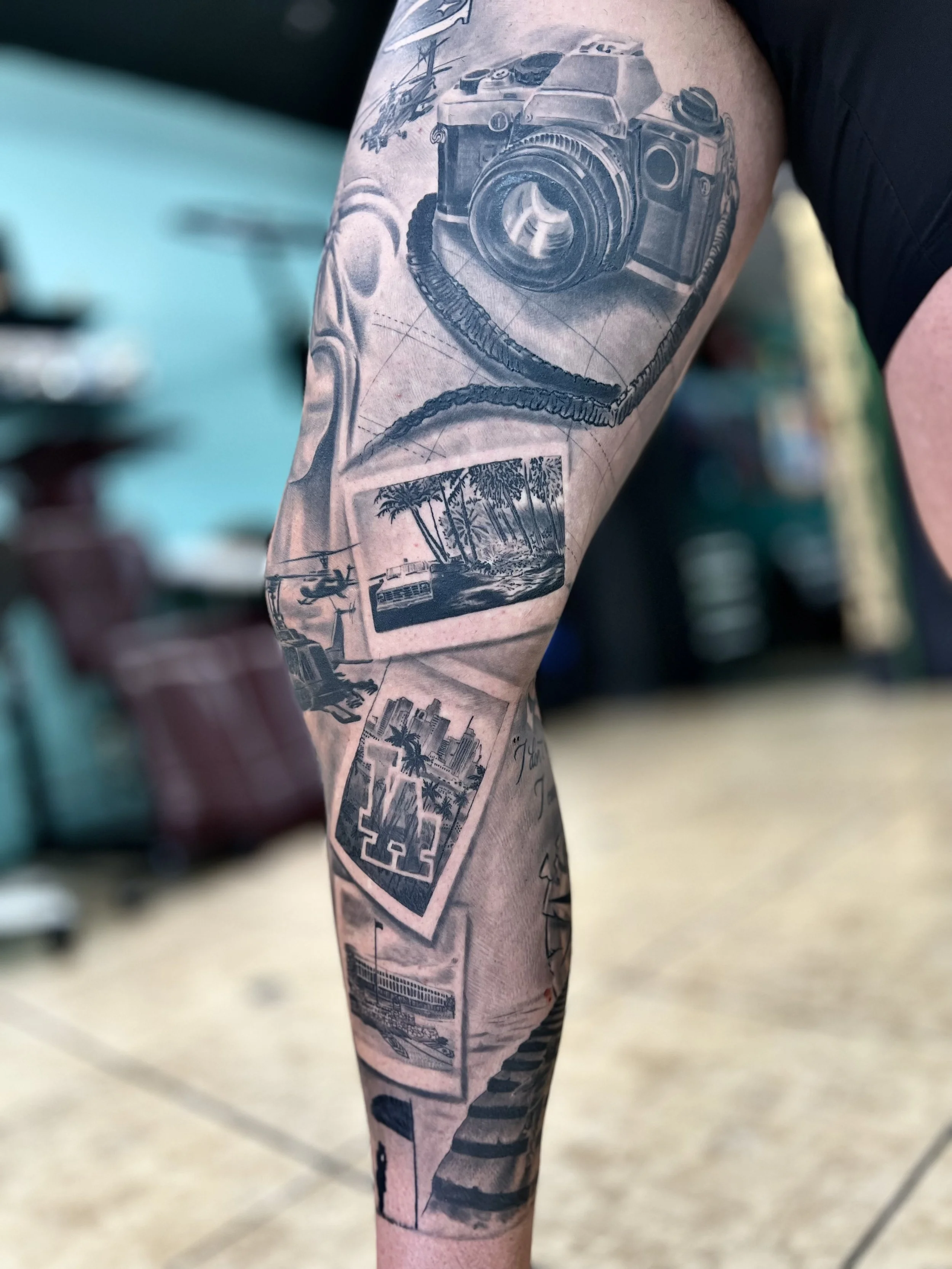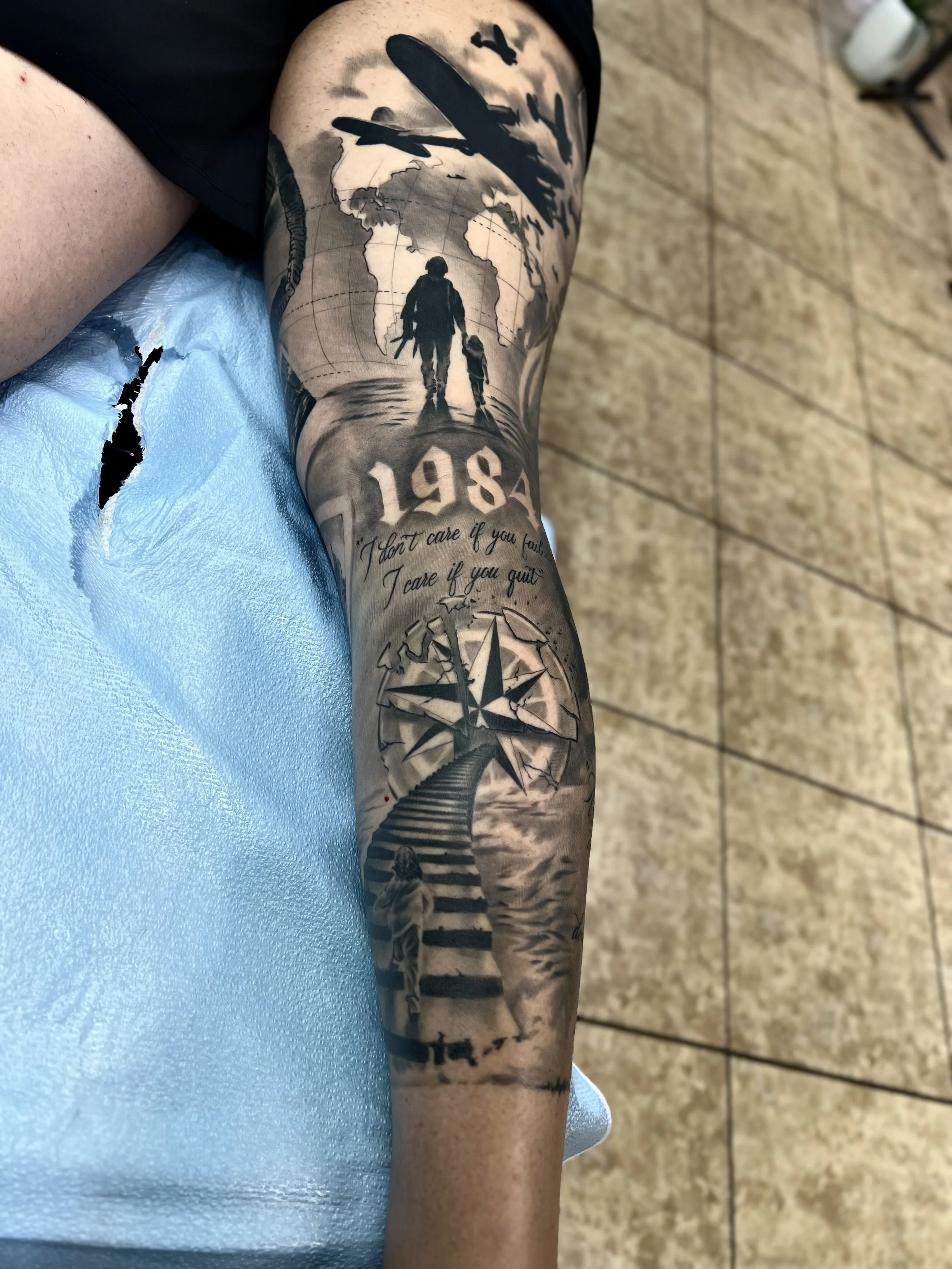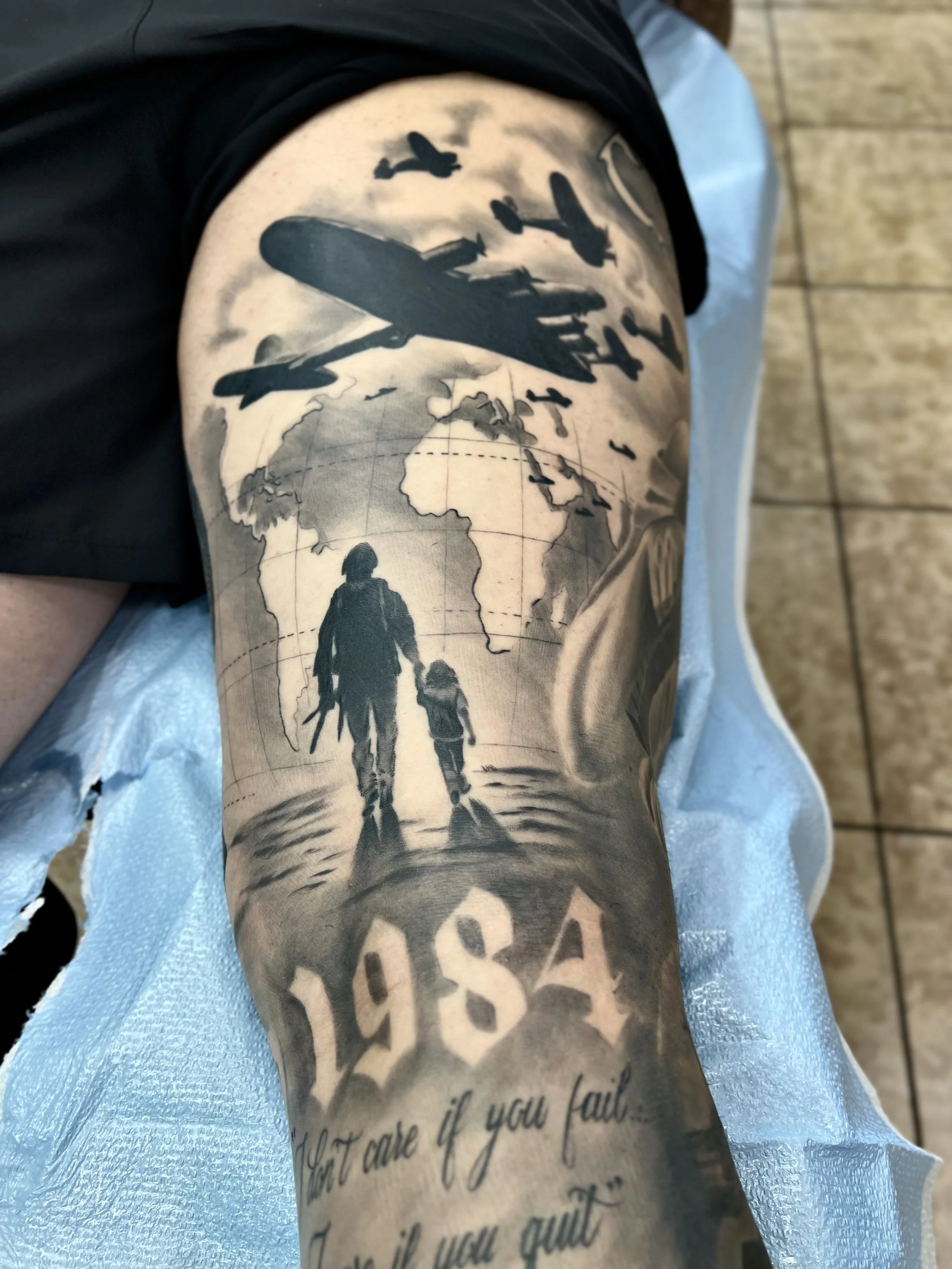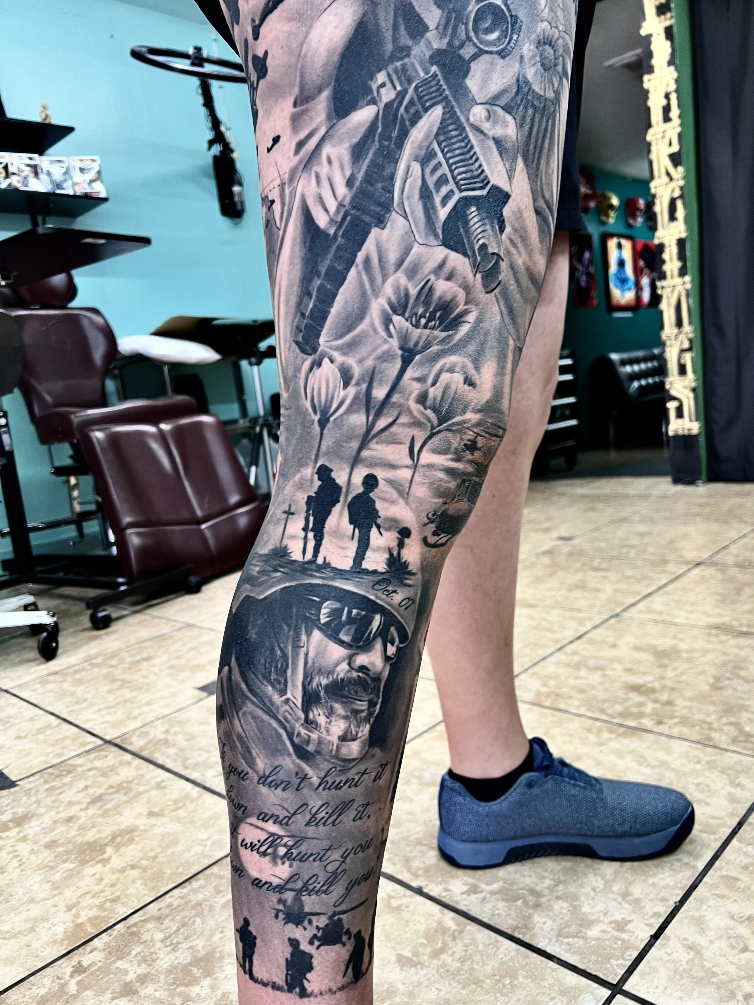 Check out this custom military-themed leg sleeve tattoo, designed for a service member and inspired by our own sniper liberty theme sleeve. This detailed piece includes symbolic elements that honor their service and tell their unique story. Contact us today to begin designing your own personalized tribute tattoo